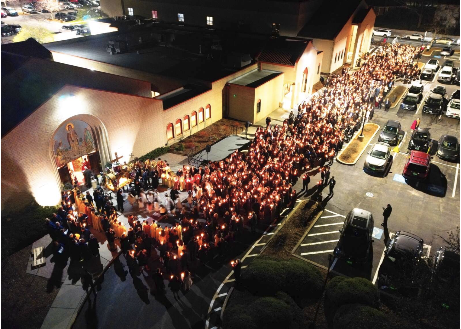 About 1,500 parishioners hold candles and wait to reenter St. Nectarios Greek Orthodox Church in Palatine after following the Epitaphios, which represents the tomb of Christ, through the parking lot during a traditional Good Friday service. John Starks/jstarks@dailyherald.com