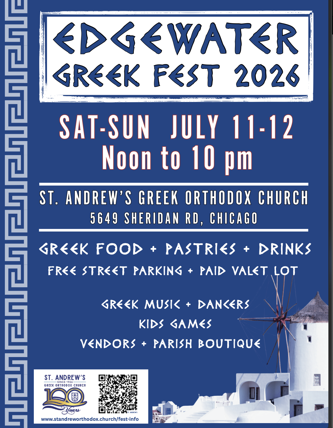 « All Events Saint Andrew Greek Orthodox Church Greek Festival 2026 Saturday, July 11, 2026 @ 12:00 pm - Sunday, July 12, 2026 @ 10:00 pm « Feast of SS. Cosmas and Damian Feast of the Prophet Elias » Add to calendar Google Calendar iCalendar Outlook 365 Outlook Live Details Start: Saturday, July 11, 2026 @ 12:00 pm End: Sunday, July 12, 2026 @ 10:00 pm Event Category: Parish Events Organizer St. Andrew Greek Orthodox Church Phone (773) 334-4515 Email info@standreworthodox.org View Organizer Website Actions Select Parish Saint Andrew, Chicago IL Venue St. Andrew’s Greek Orthodox Church 5649 N Sheridan Rd Chicago, IL 60660 United States + Google Map
