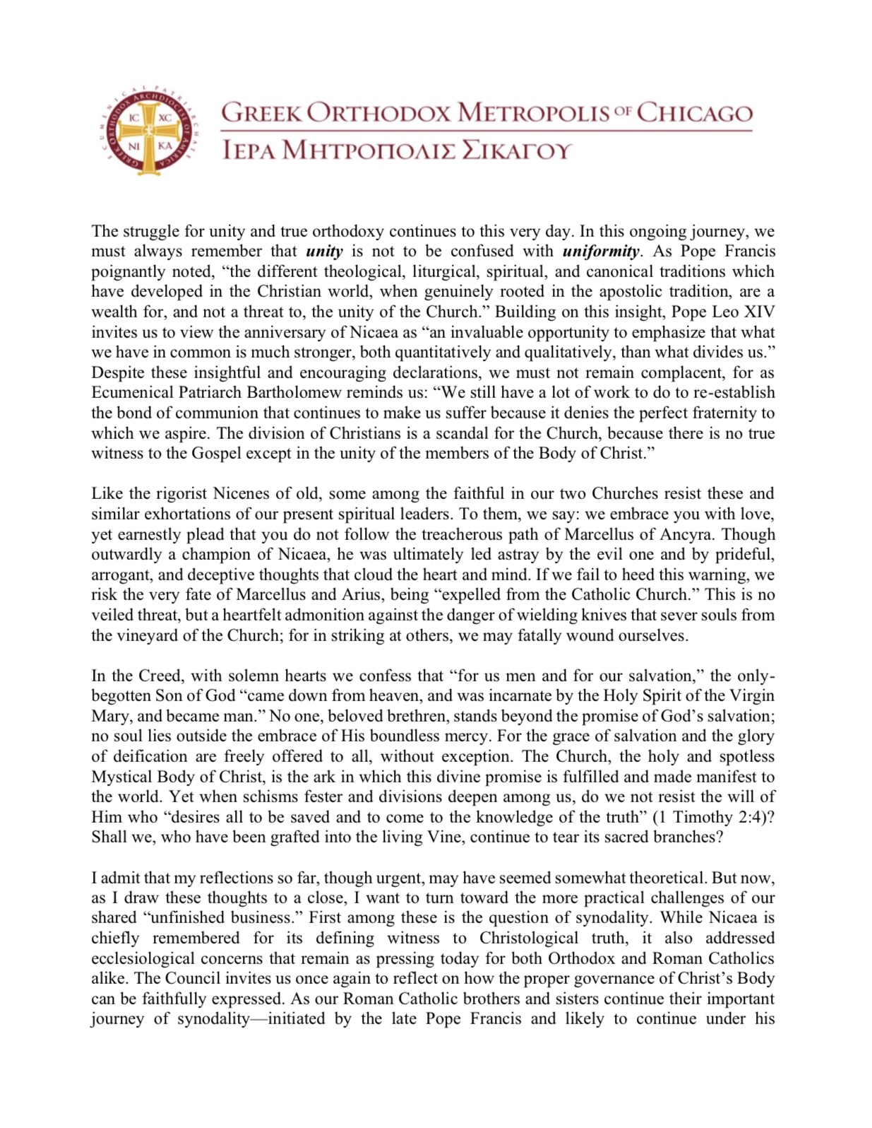 Back to all news September 2, 2025 The “Unfinished Business” of Nicaea: His Eminence Metropolitan Nathanael of Chicago Ecumenical Commemoration of the 1700 Anniversary of the Council of Nicaea Recent posts January 21, 2026 What We Can Learn from Abraham Lincoln About Humility and Candor During my recent travels through the Vicariate of Southeastern Missouri and Southern and Central Illinois—visiting... January 20, 2026 Metropolitan Nathanael Brings Illinois Leaders Together in Springfield to Affirm Faith in Public Service SPRINGFIELD, IL, JANUARY, 20, 2026 — His Eminence Metropolitan Nathanael of Chicago recently convened a private... January 14, 2026 Metropolis of Chicago Launches First Annual Project HOPE Sunday LOMBARD, IL, January 12, 2026 – The Greek Orthodox Metropolis of Chicago is proud to announce the first annual Project...
